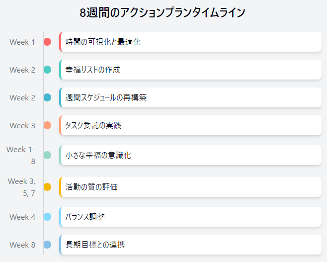 このアクションプランを通じて、あなたも日々の生活に小さな、しかし確かな変化をもたらし、より幸せで充実した毎日を送ることができるでしょう。remember、幸せになるために何か大きなことを成し遂げる必要はありません。あなたの存在自体が誰かの喜びになっているのです。